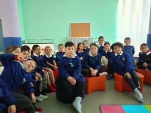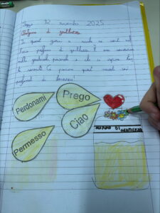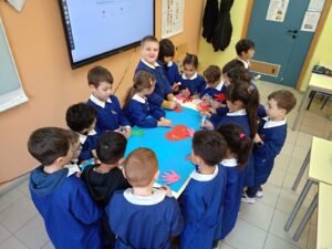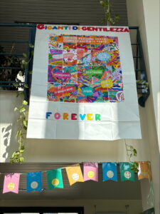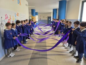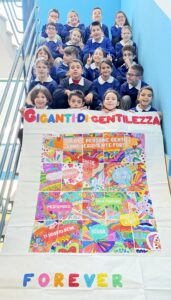I Piccoli Alighieri delle classi quarte hanno rappresentato simbolicamente i gesti gentili come delle “onde”. L’attività è stata introdotta dall’ascolto della canzone “Onde Gentili”. Il testo del brano è stato analizzato, focalizzando l’attenzione sul concetto di come un piccolo gesto positivo possa generare un effetto a catena, proprio come un’onda che si propaga. Poi, con delle strisce di carta crespa, ogni alunno ha mosso ritmicamente le strisce di carta crespa per rappresentare l’andamento e il movimento fluido delle “onde gentili”, visualizzando concretamente come un’azione (il movimento iniziale) si trasmetta e si amplifichi, coinvolgendo l’intero spazio. Il messaggio: la gentilezza non è un atto isolato, ma una forza capace di muovere e influenzare positivamente la comunità. Quante “onde gentili” si possono generare ogni giorno a scuola e in famiglia!