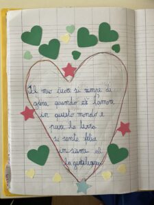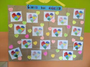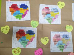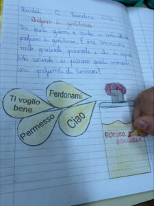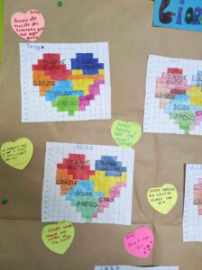 I Piccoli Alighieri delle classi quinte hanno immaginato la gentilezza come un piacevole profumo spray che emana goccioline con scritte all’interno parole gentili: ti voglio bene, perdonami, permesso, ciao, grazie, prego, scusa, ho sbagliato, mi dispiace, facciamo pace. Hanno scritto significativi testi, anche in inglese. Poi si sono cimentati nella realizzazione di un cuore in pixel art colmo di parole gentili. La cosa bella è stata che inizialmente gli alunni hanno notato solo delle parole su un foglio a quadretti ma, man mano che utilizzavano i codici dati, è apparso un cuore tutto colorato. I vari cuori sono stati incollati su un grande cartellone appeso in classe contornato da tante belle frasi gentili che i bambini hanno voluto dedicare a qualcuno di caro!