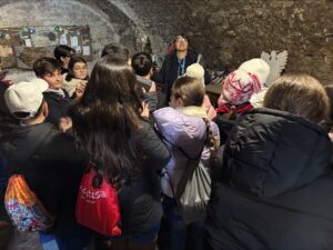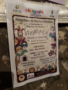 Grazie al Comune di Foggia che ha organizzato l’evento “Il Carnevale a Foggia”, i Piccoli Alighieri hanno avuto la possibilità di partecipare ad uno degli eventi programmati nel cartellone: “Maschere di storia e musica: il Carnevale tra Federico II e Umberto Giordano”. Le due classi in mattinata si sono recate a piedi in piazza Purgatorio, dove sono situati gli storici Ipogei cittadini. Dopo una suggestiva visita nelle viscere dell’antica Fovea, guidata dall’esperta Franca Palese, guida turistica autorizzata, i bambini hanno partecipato ad un laboratorio artistico-creativo, a cura dell’associazione CREA a.p.s., per integrare armoniosamente arte, musica e storia della nostra città.
